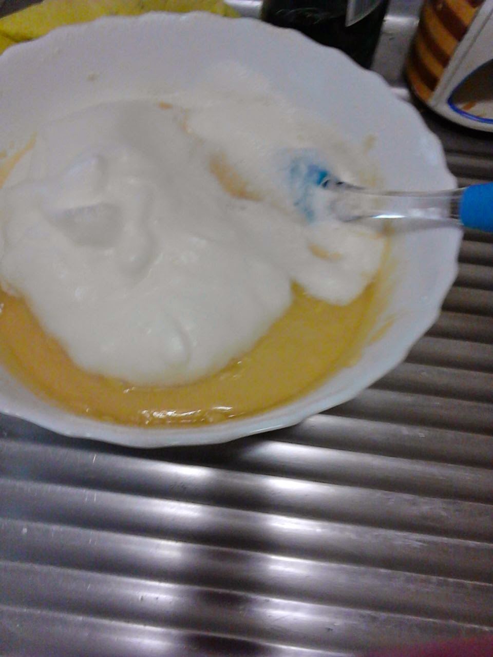 Añadimos al bol con la mezcla las claras a punto de nieve y lo mezclamos todo, cuidadosamente, con movimientos envolventes (sin presionar para que no se bajen las claras). Pasamos la mezcla al molde que teníamos reservado en la nevera y con el horno precalentado a 180º, horneamos durante 40-45 minutos, podéis pinchar con un palillo y si sale limpio, es que el bizcocho ya está listo.